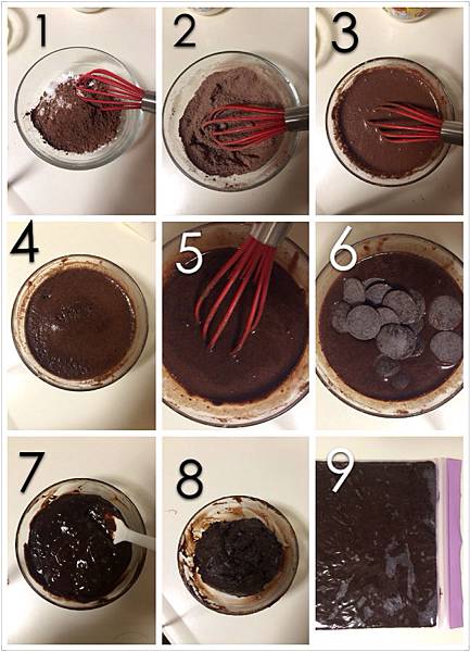 8. 拌勻 (這時巧克力糊越來越固體) 加入奶油, 再微波1分鐘