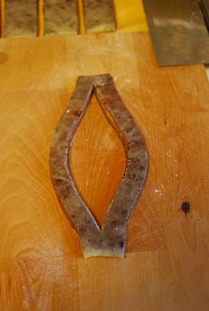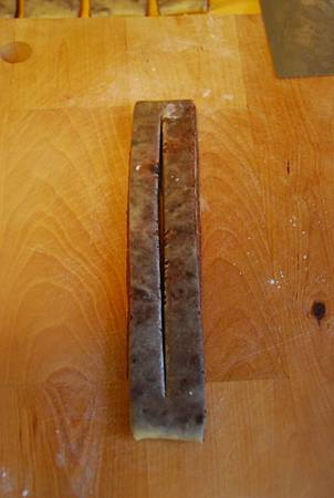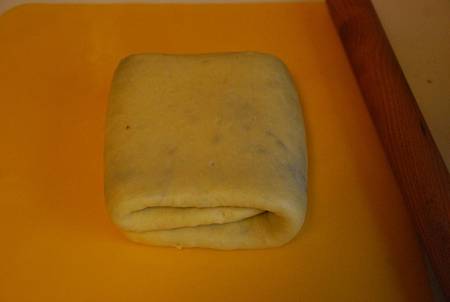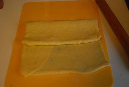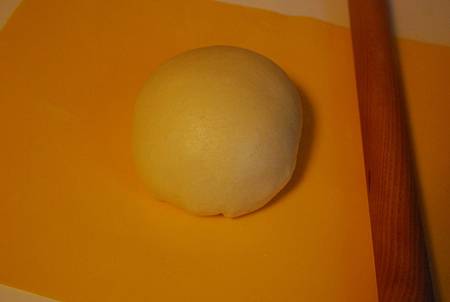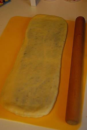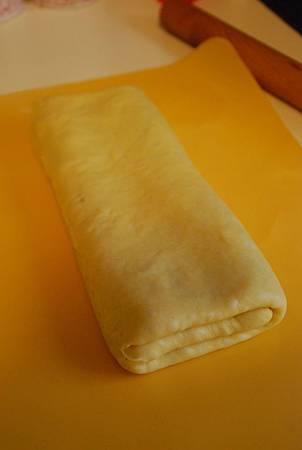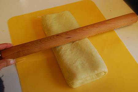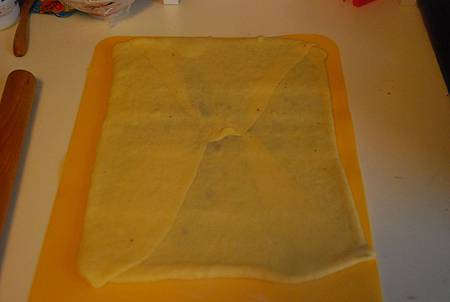3. 用擀麵棍壓十字, 然後從4邊凸出來部份往外桿, 這樣麵團比較容易壓成4方型